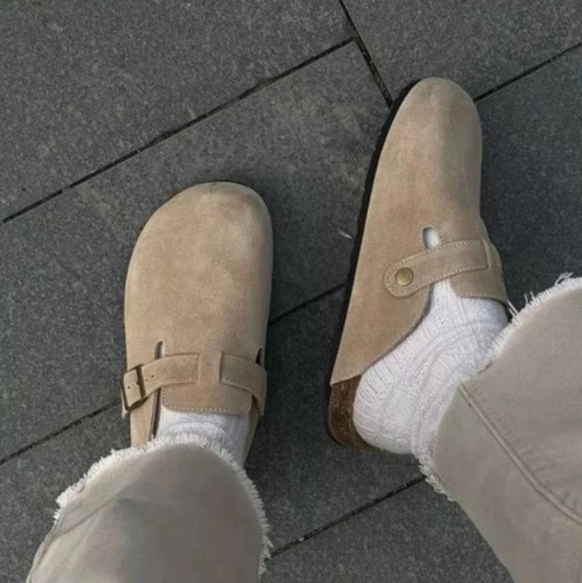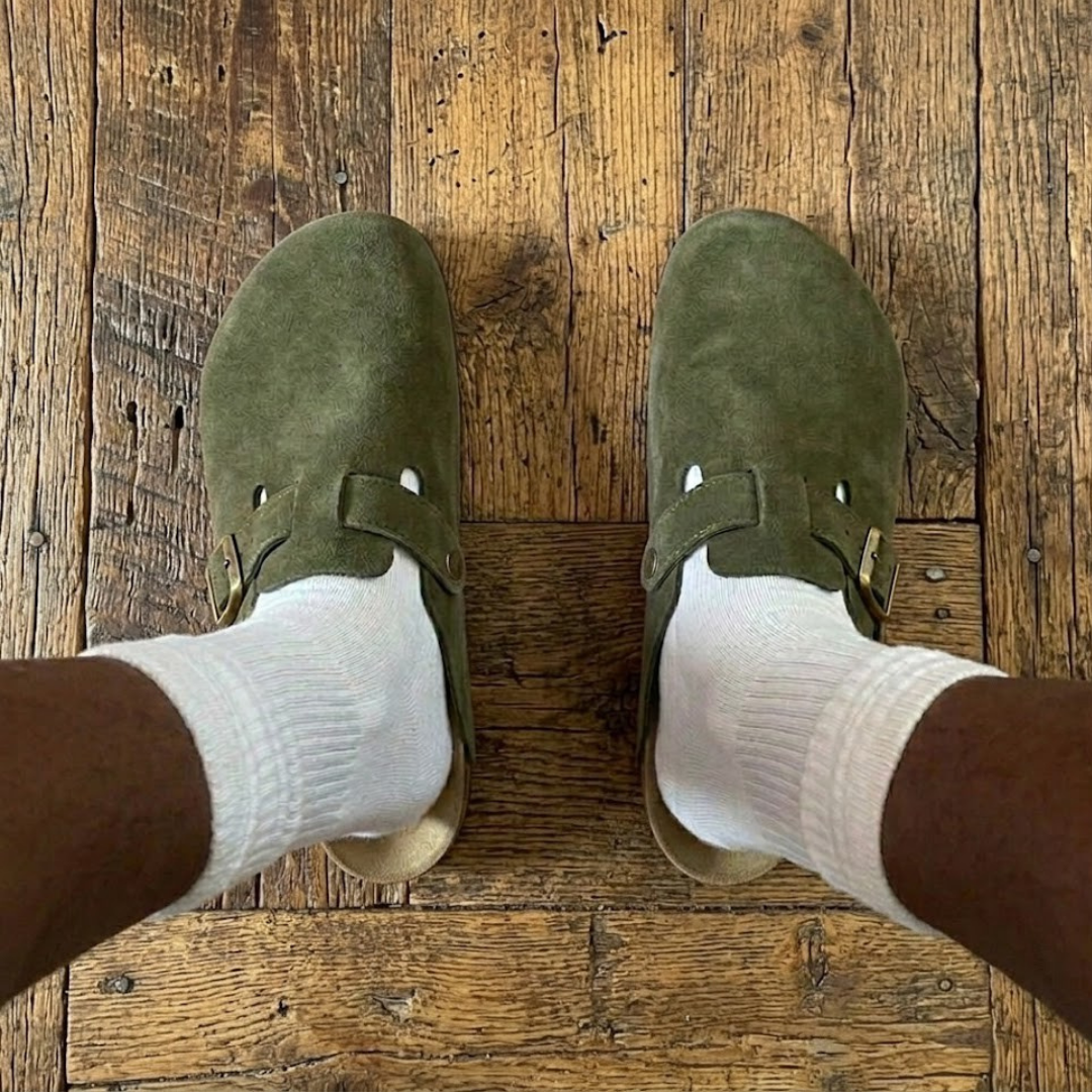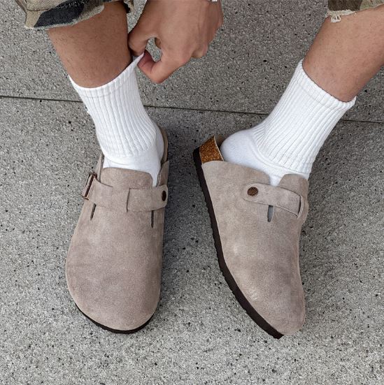 The suede upper, cushioned footbed, and natural cork layer all soften and adapt with wear, giving you a more personalized, comfortable fit the longer you use them