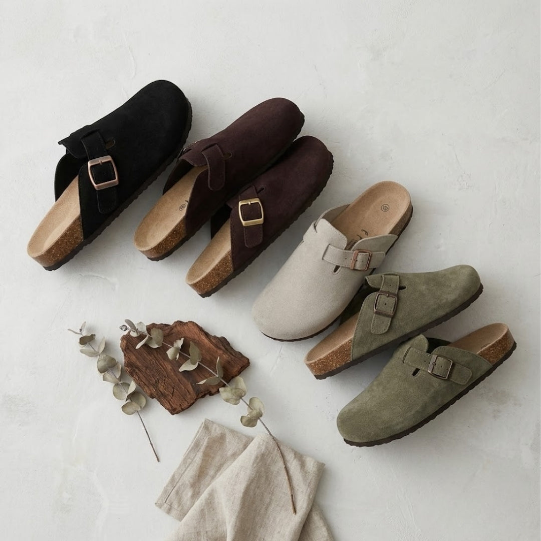 The suede upper, cushioned footbed, and natural cork layer all soften and adapt with wear, giving you a more personalized, comfortable fit the longer you use them